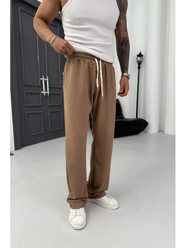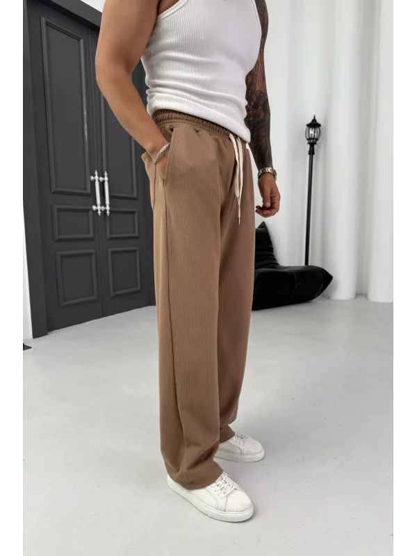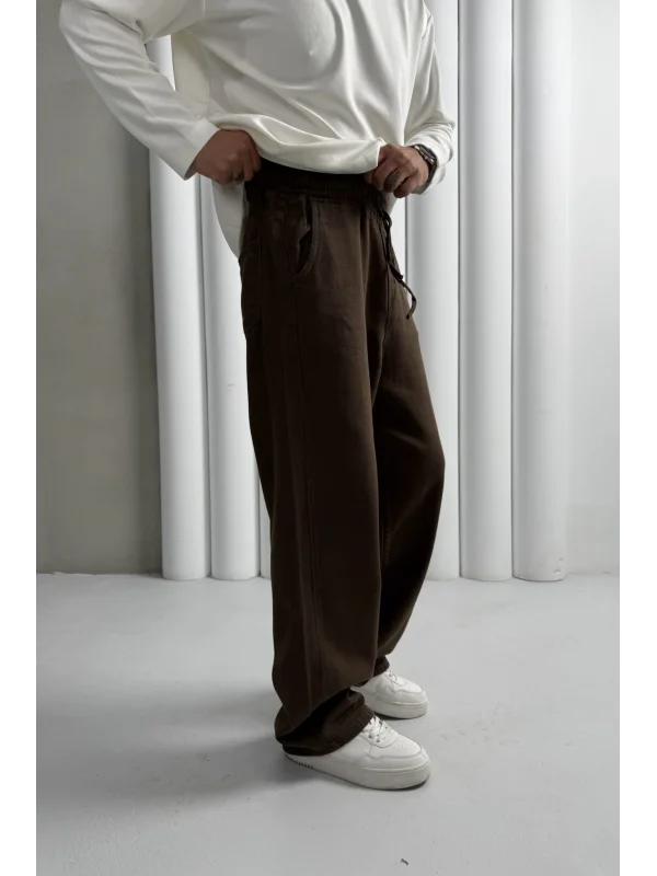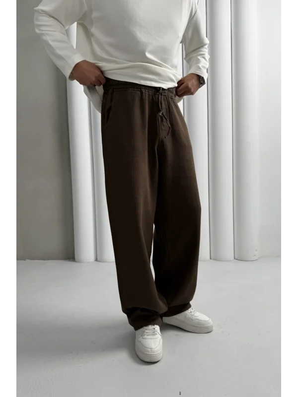 Yıkamalı üç iplik şardonsuz baggy pantolon kahve
