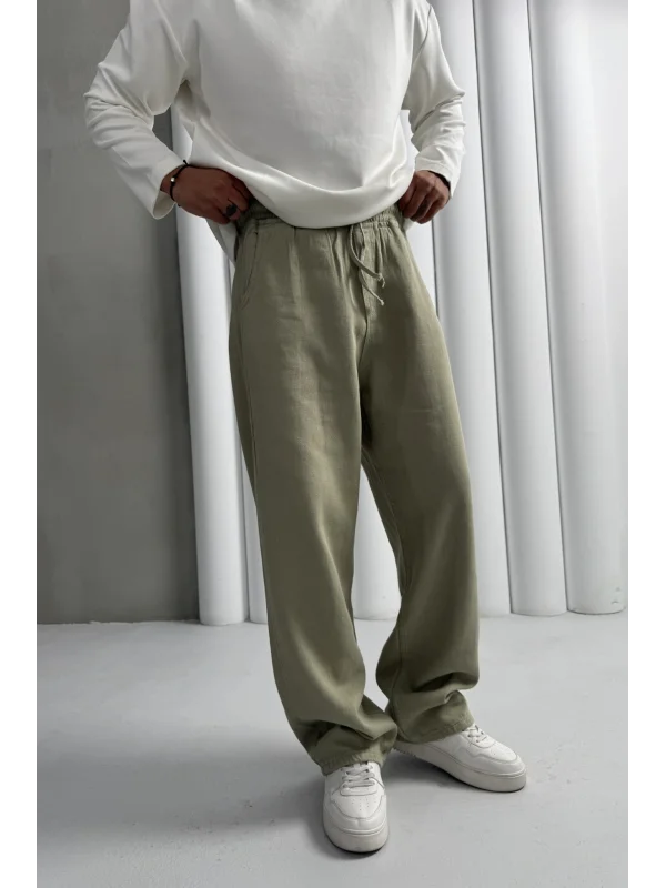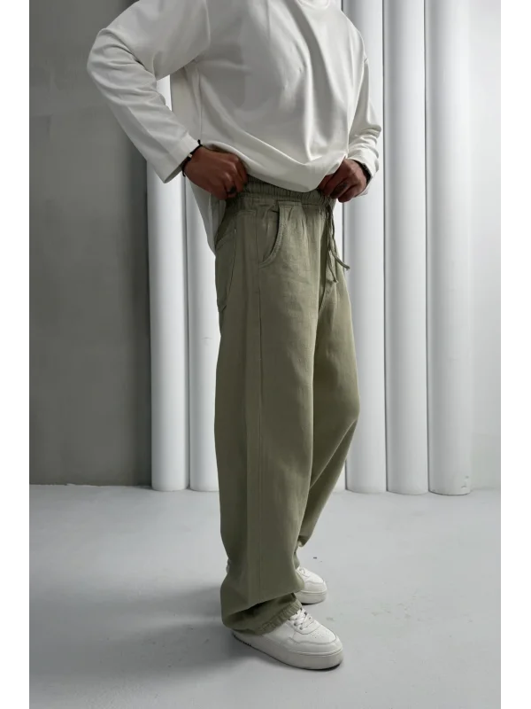 Yıkamalı üç iplik şardonsuz baggy pantolon haki